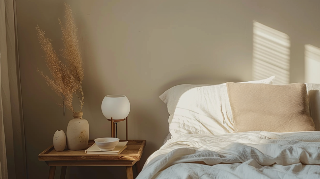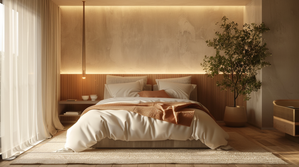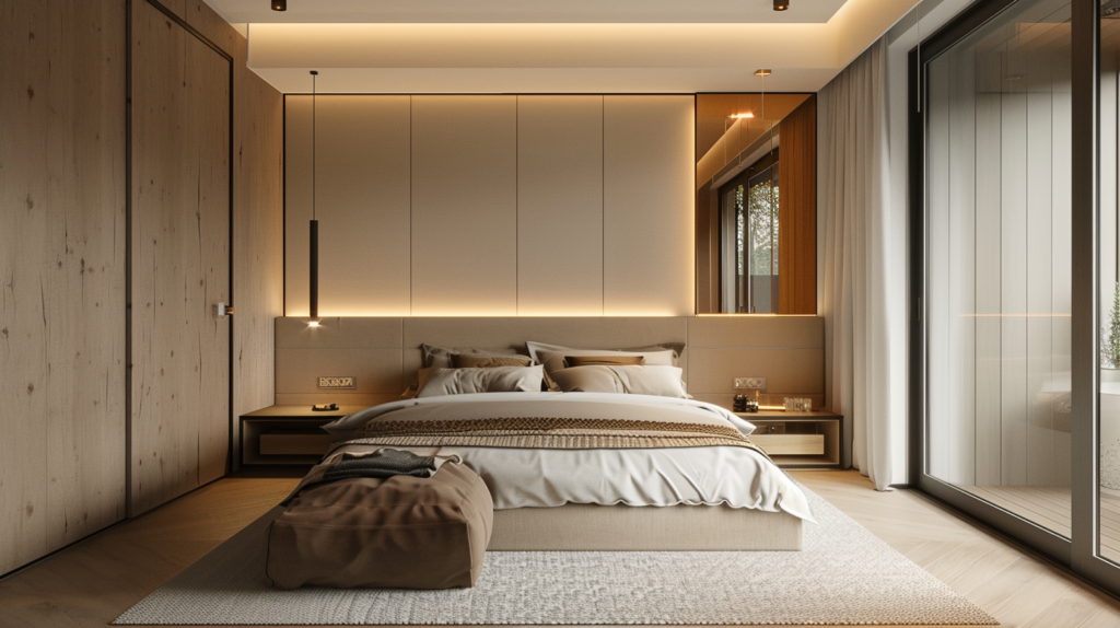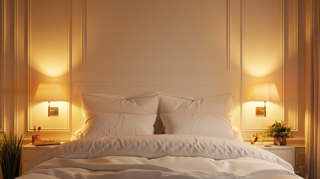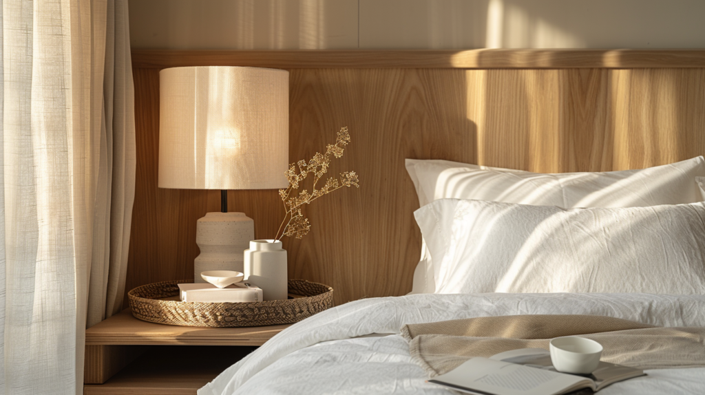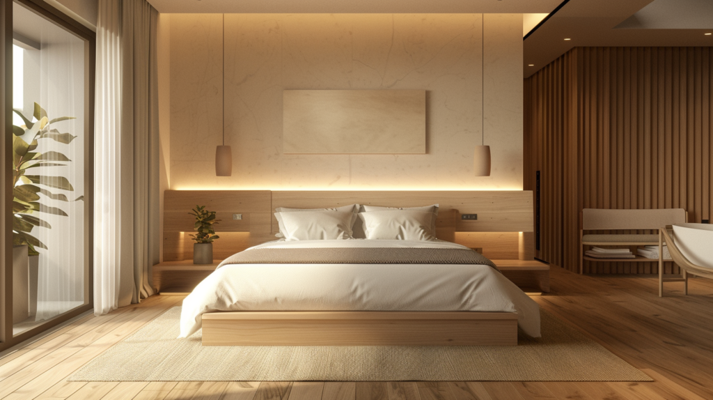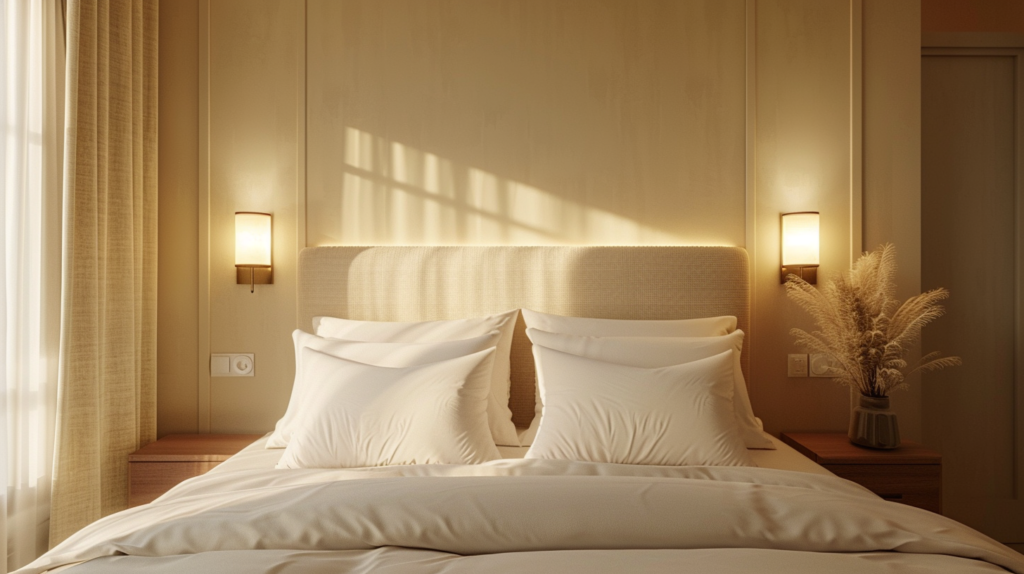 - optional soft accent light (LED behind headboard / corner floor lamp)