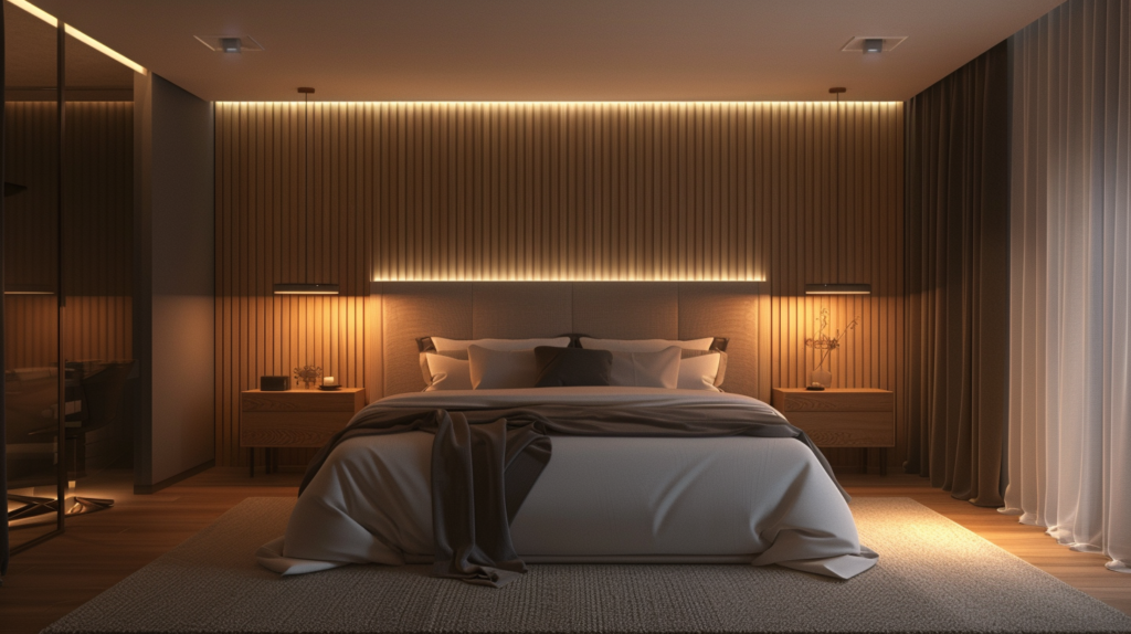 - Accent: LED behind headboard / soft wall sconce / corner floor lamp