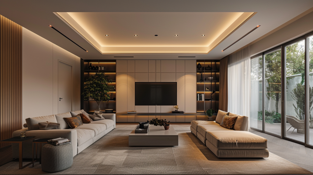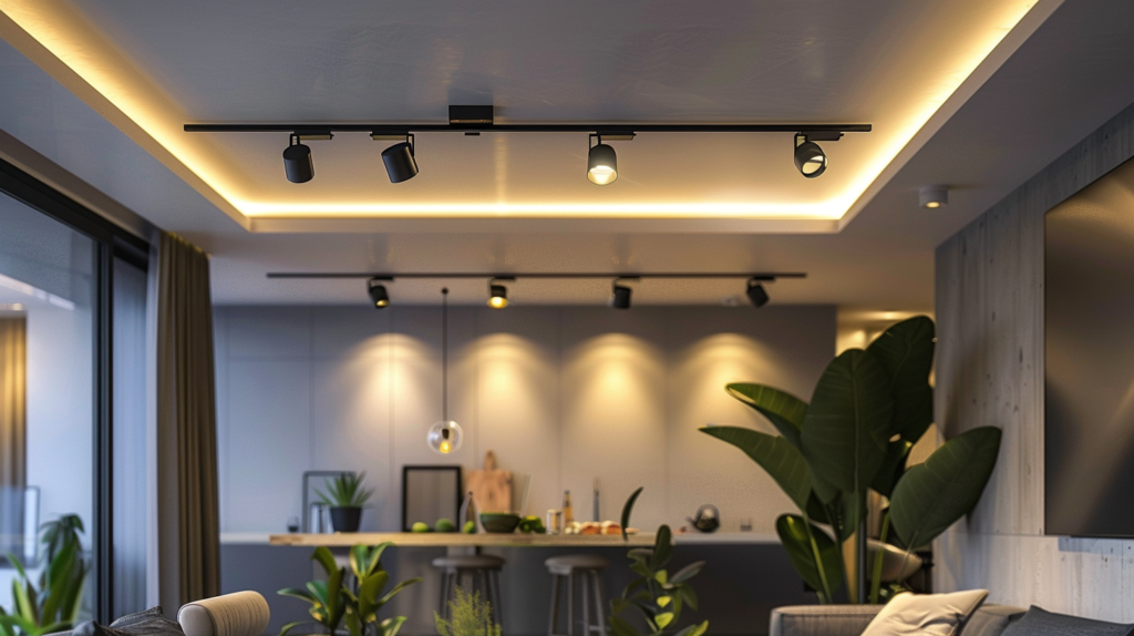 - Accent: wall light, LED behind TV, spotlight on art/plant