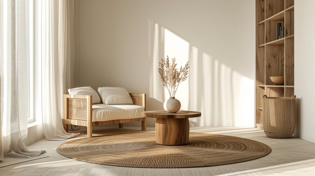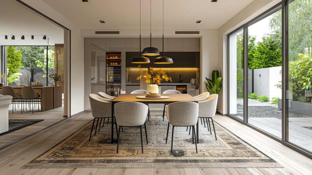 - Round rug for round tables (same rule: add 60–75 cm all around)