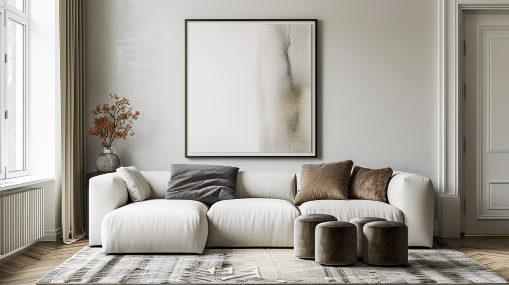 - Keep the bottom of the art about 15–25 cm above the sofa